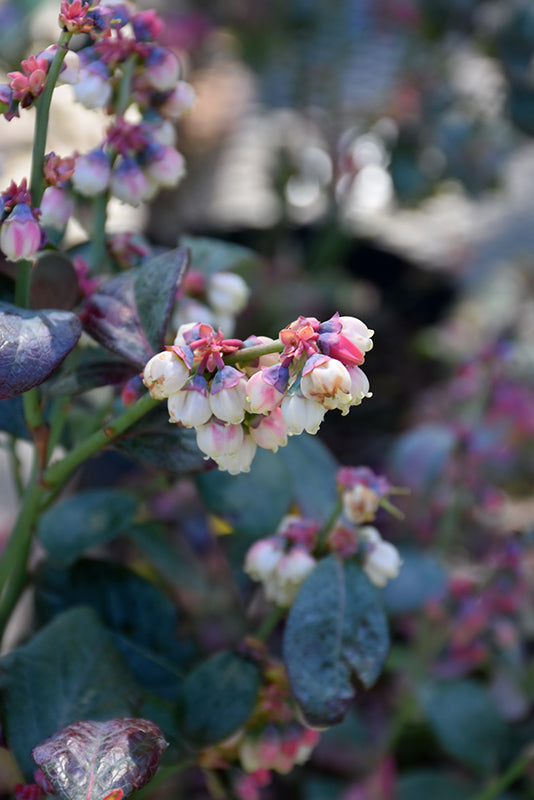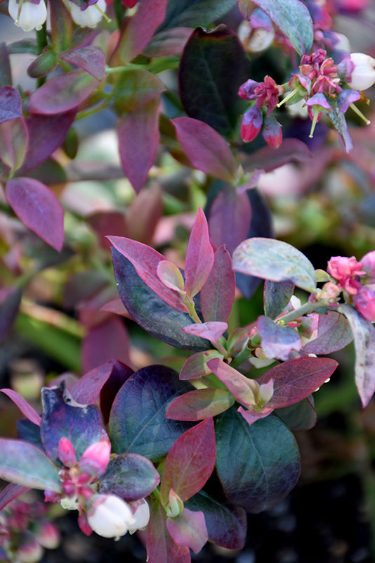 A stunning variety with beautiful spring foliage; hues of pink and blue-green, turning turquoise in fall; produces large, sweet blue fruit in mid summer; blueberries require highly acidic soils, excellent drainage and a good mulch, plant with peat moss