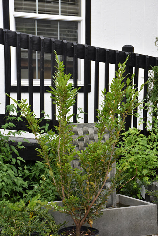 An attractive evergreen plant with emerging light green foliage that matures to a glossy dark green; in late winter to early spring, reddish-maroon flowers emerge along the older branches; very elegant when massed together or as an accent shrub