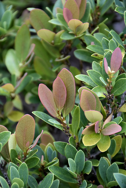 An attractive evergreen plant with emerging coppery-red new foliage that matures to a matte finish blue-green; in late winter to early spring, red flowers emerge along the older branches; very elegant when massed together or as an accent shrub