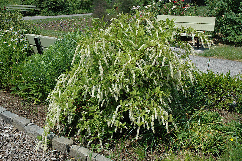 A compact spreading version of this native shrub which features extremely long and narrow panicles of white flowers in early summer, consistently reddish-purple fall color; good for the garden or for naturalizing, spreads to form small colonies